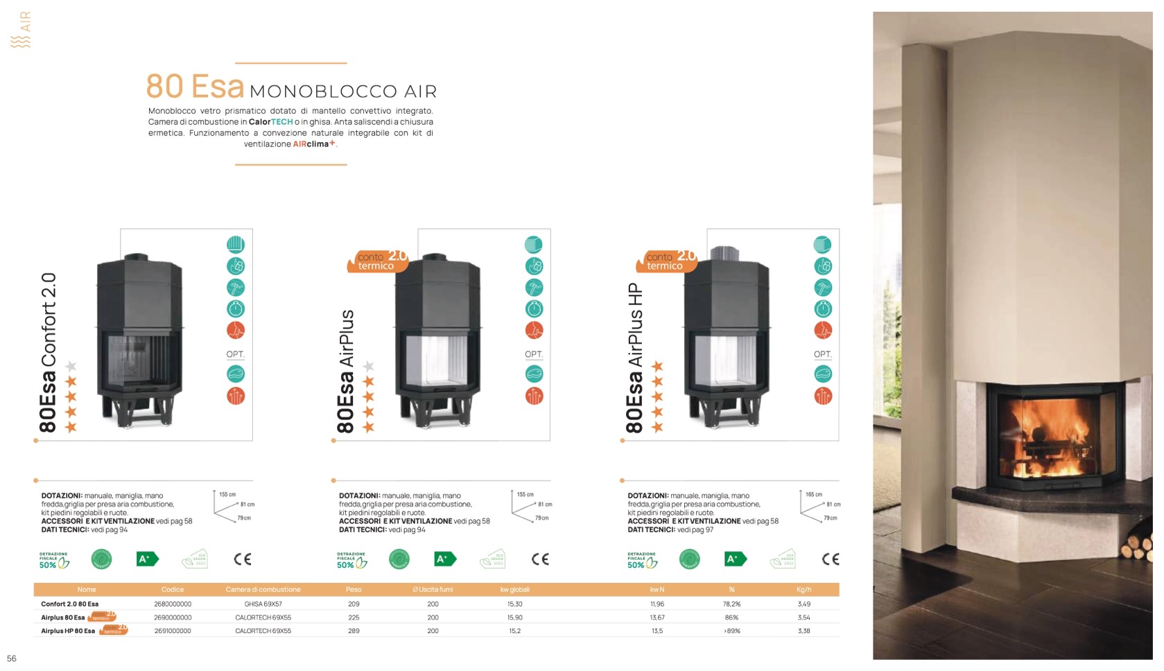 Camera di combustione in CalorTECH o in ghisa. Anta saliscendi a chiusura