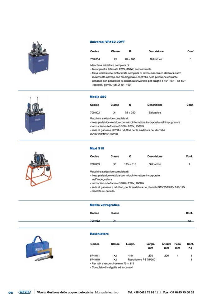 - serie di ganasce e riduttori, per la saldatura dei diametri 315/250/200/ 160/125