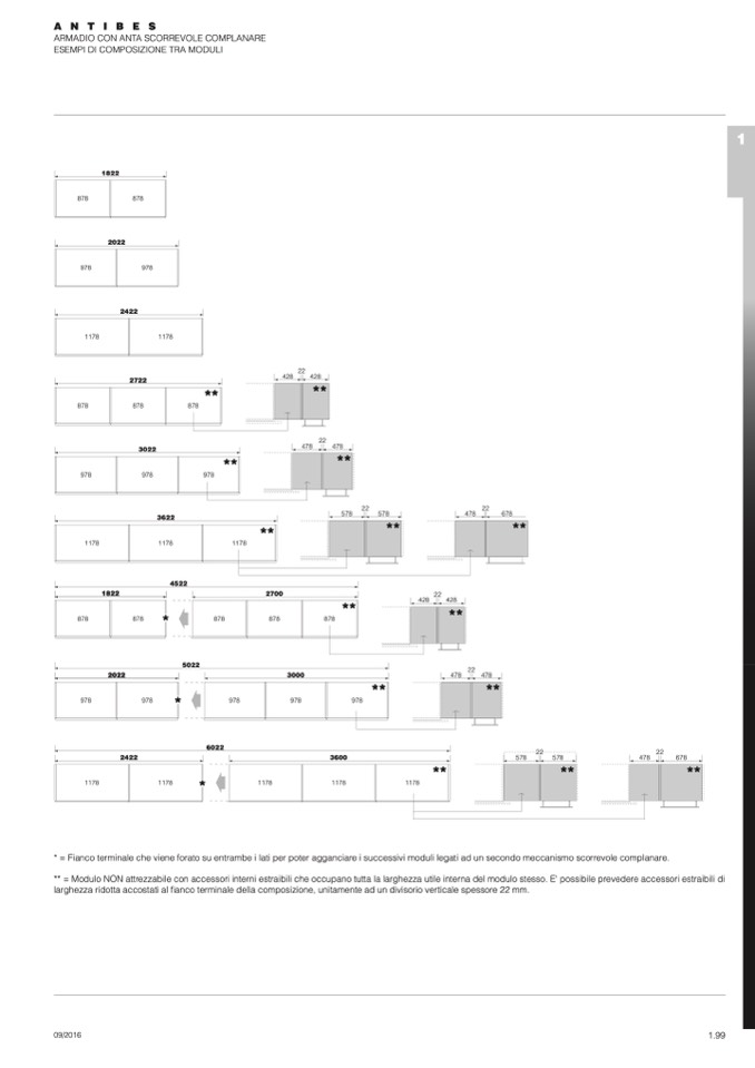 larghezza ridotta accostati al fianco terminale della composizione, unitamente ad un divisorio verticale spessore 22 mm.