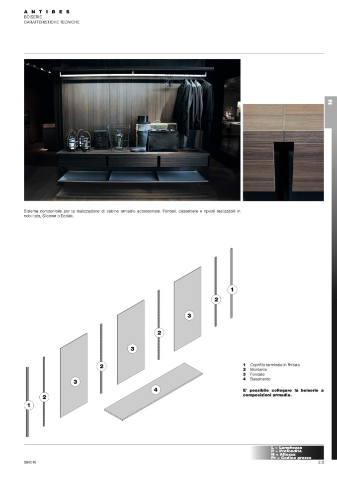 Sistema componibile per la realizzazione di cabine armadio accessoriate. Fondali, cassettiere e ripiani realizzabili in