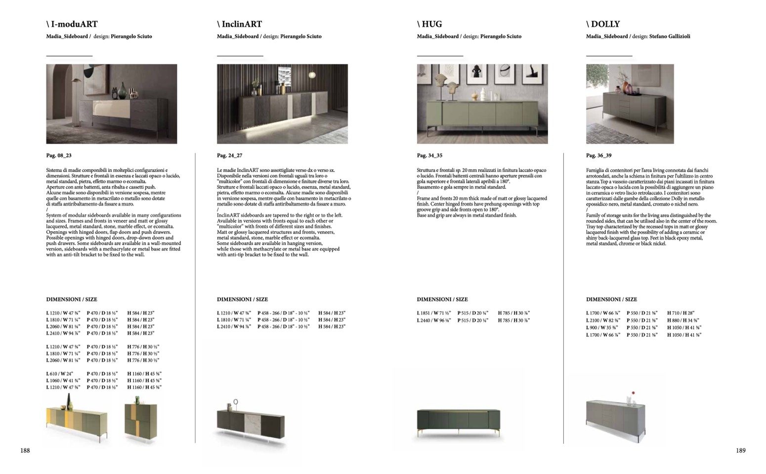 dimensioni. Strutture e frontali in essenza e laccati opaco o lucido,