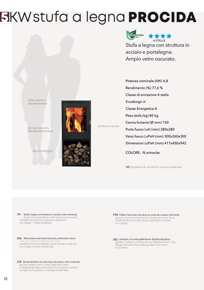 ITA Stufa a legna con struttura in acciaio color antracite,