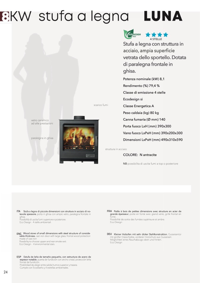 tevole spessore, porta in ghisa con ampio vetro, paralegna frontale in