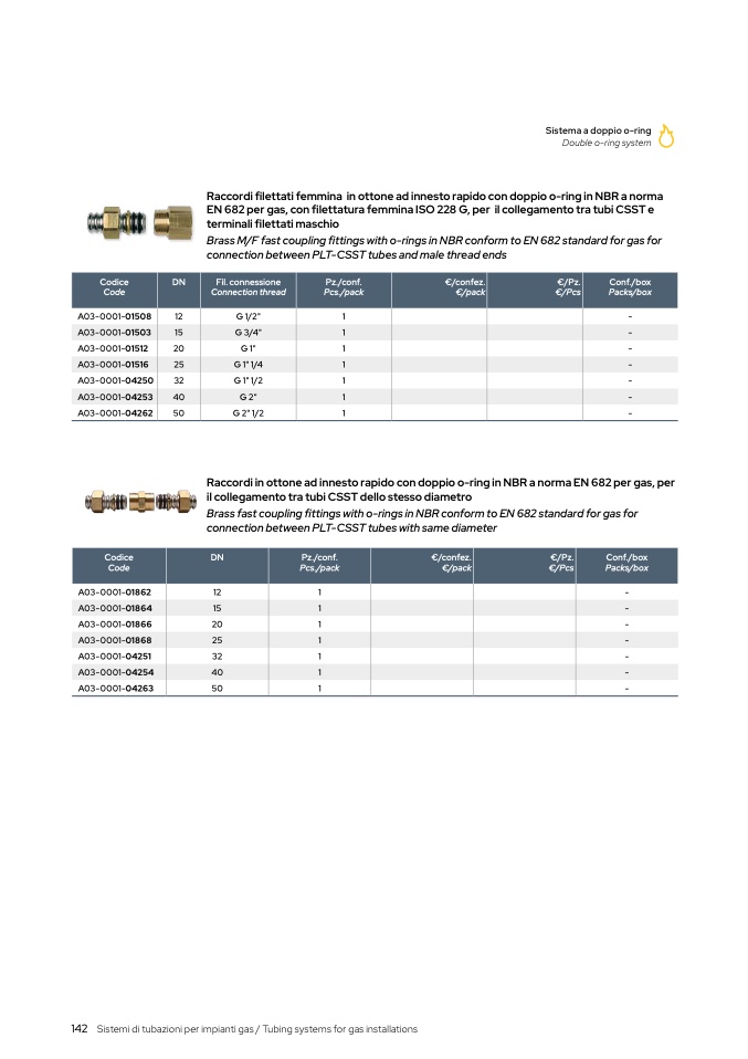 Raccordi in ottone ad innesto rapido con doppio o-ring in NBR a norma EN 682 per gas, pe