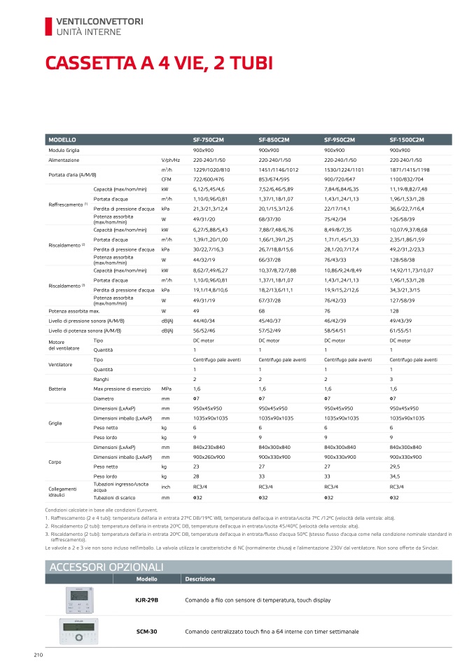 1. Raffrescamento (2 e 4 tubi): temperatura dell'aria in entrata 27°C DB/19°C WB, temperatura dell'acqua in entrata/uscita 7°C /12°C (velocità della ventola: alta).