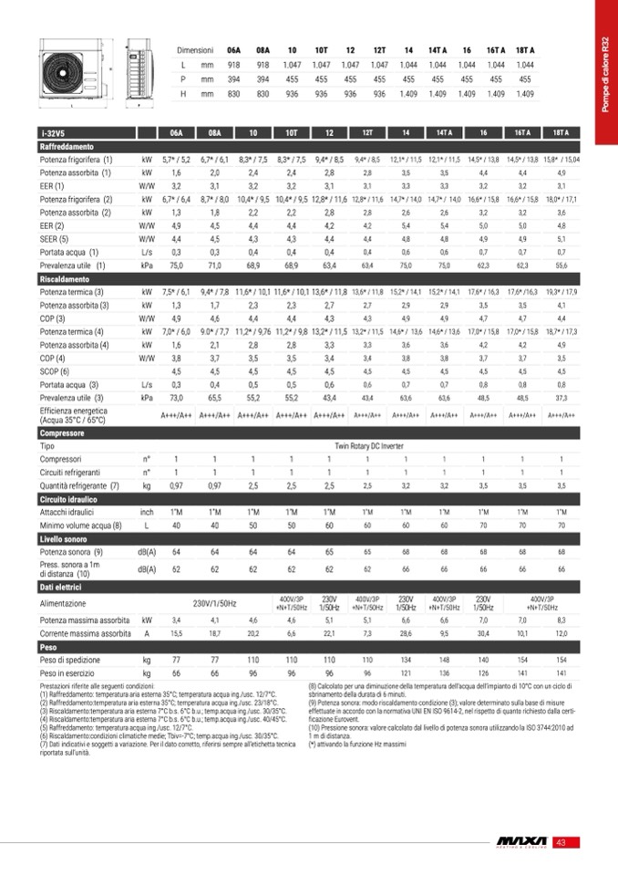 (1) Raffreddamento: temperatura aria esterna 35°C; temperatura acqua ing./usc. 12/7°C.