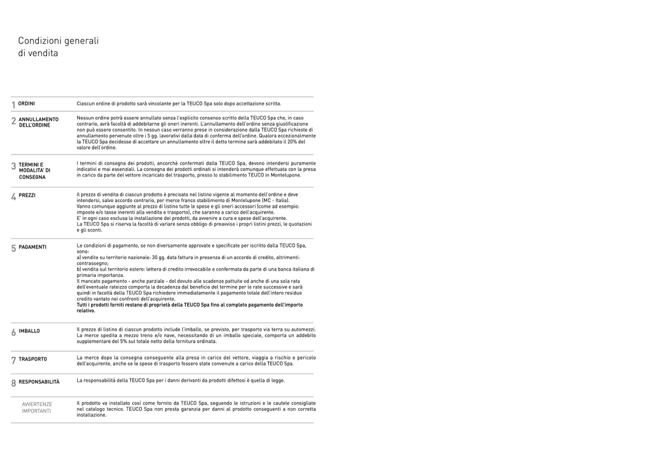 Ciascun ordine di prodotto sarà vincolante per la TEUCO Spa solo dopo accettazione scritta.