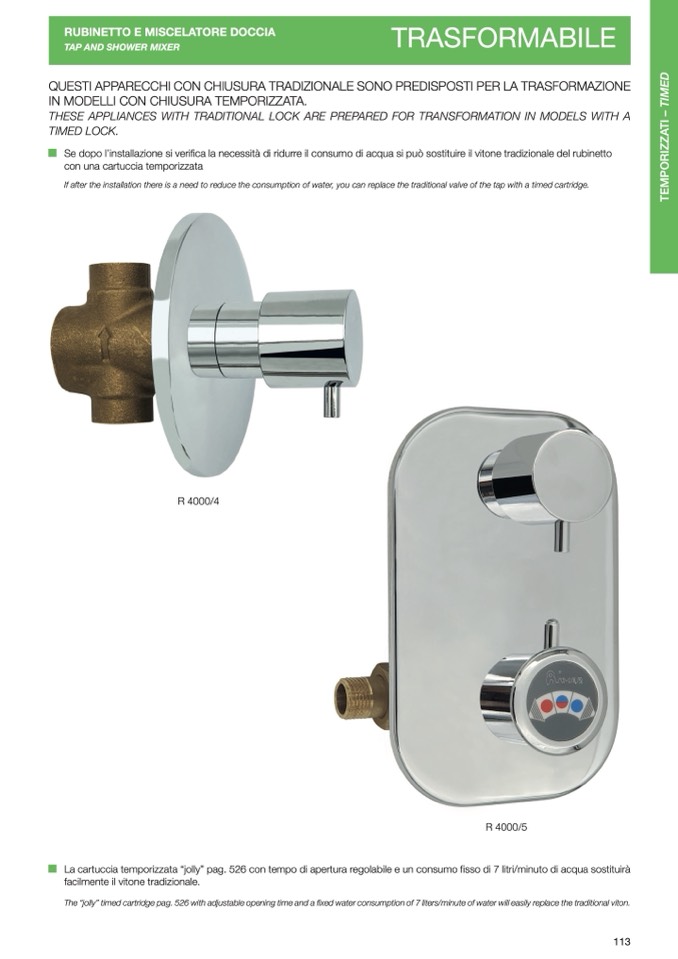 La cartuccia temporizzata “jolly” pag. 526 con tempo di apertura regolabile e un consumo fisso di 7 litri/minuto di acqua sostituirà