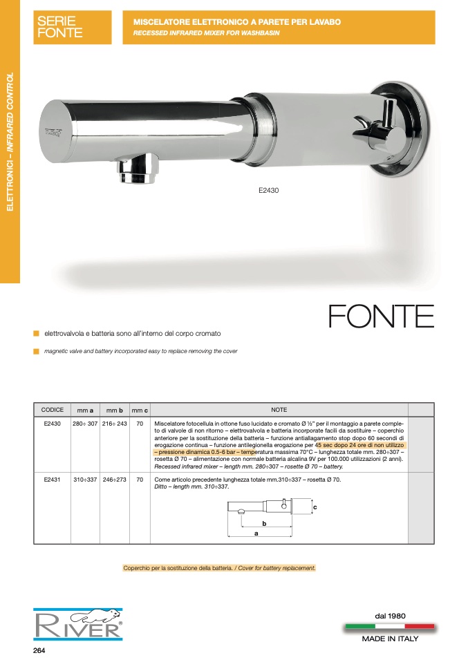 – pressione dinamica 0.5-6 bar – temperatura massima 70°C – lunghezza totale mm. 280÷307 –