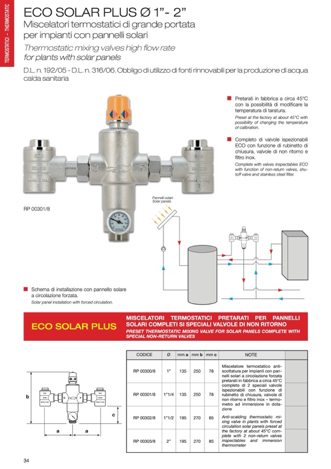 PRESET THERMOSTATIC MIXING VALVE FOR SOLAR PANELS COMPLETE WITH