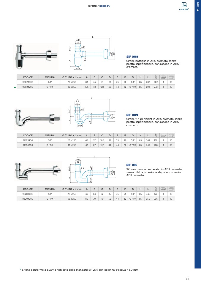 * Sifone conforme a quanto richiesto dallo standard EN 274 con colonna d’acqua > 50 mm