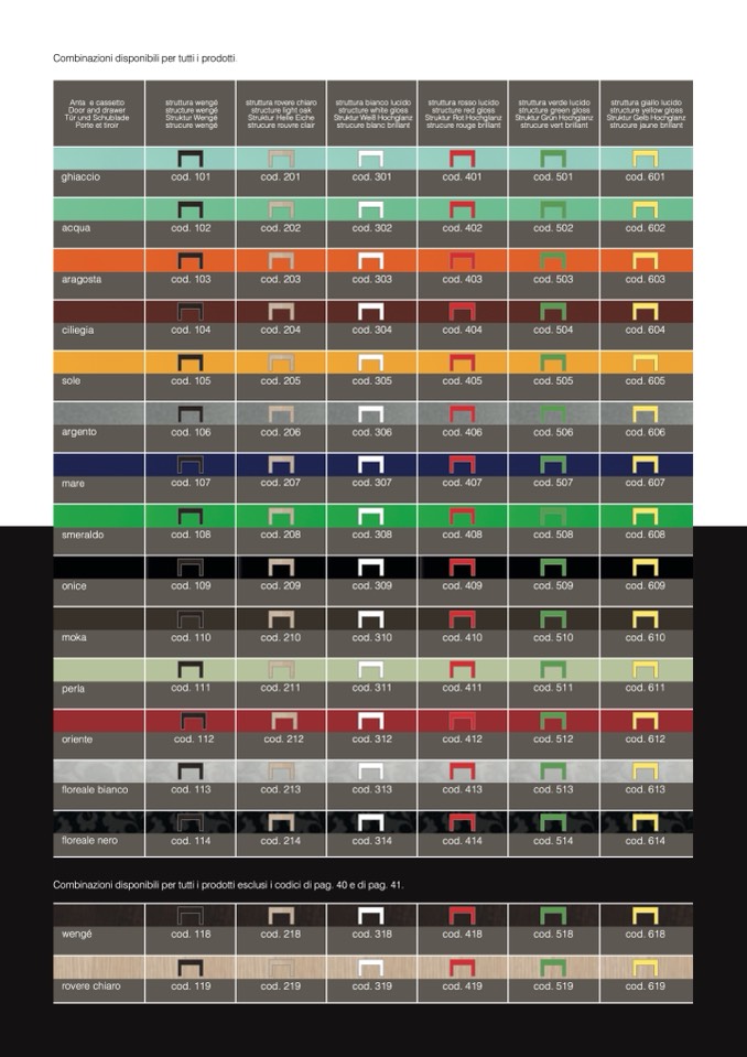 Combinazioni disponibili per tutti i prodotti esclusi i codici di pag. 40 e di pag. 41.