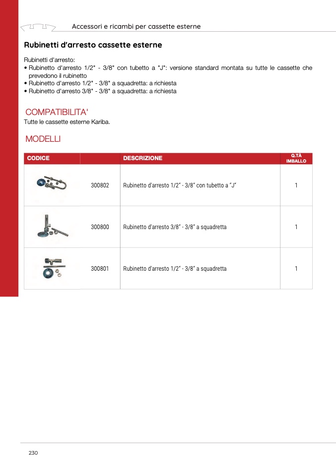 • Rubinetto d'arresto 1/2" - 3/8" con tubetto a "J": versione standard montata su tutte le cassette che