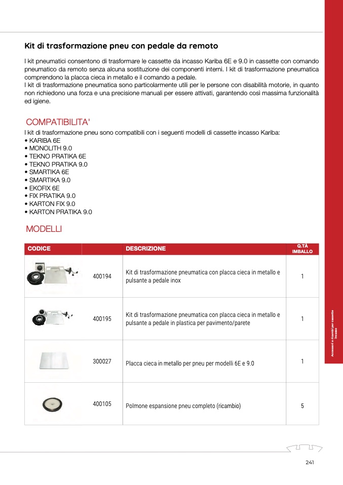 I kit di trasformazione pneu sono compatibili con i seguenti modelli di cassette incasso Kariba: