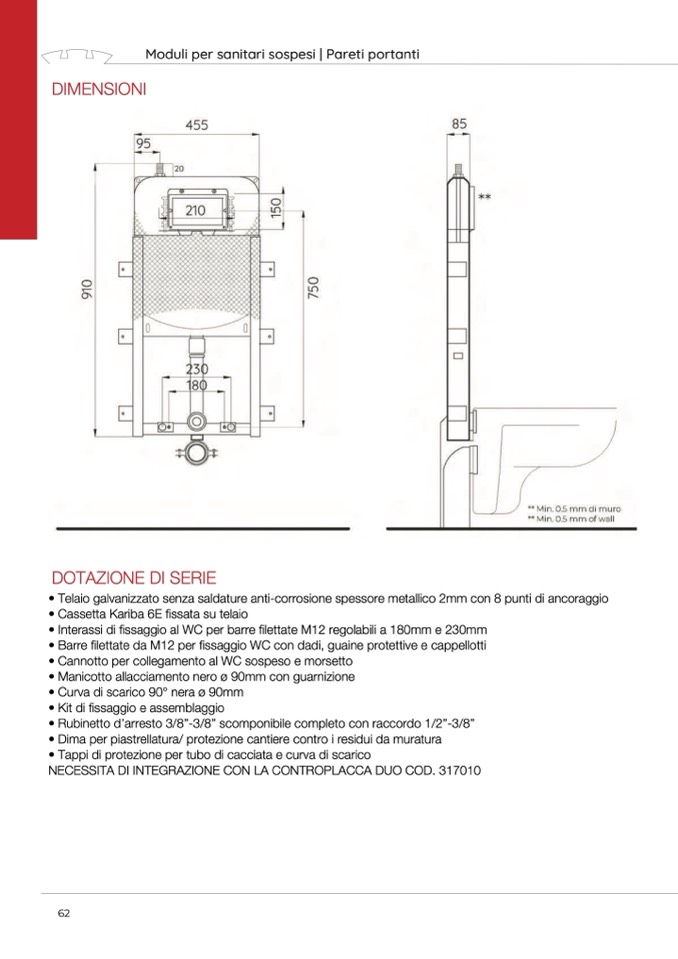 • Barre filettate da M12 per fissaggio WC con dadi, guaine protettive e cappellotti