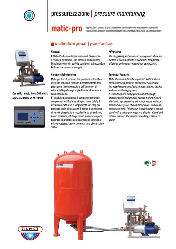 Applicazioni : sistema di pressurizzazione con riempimento e deareazione automatici.