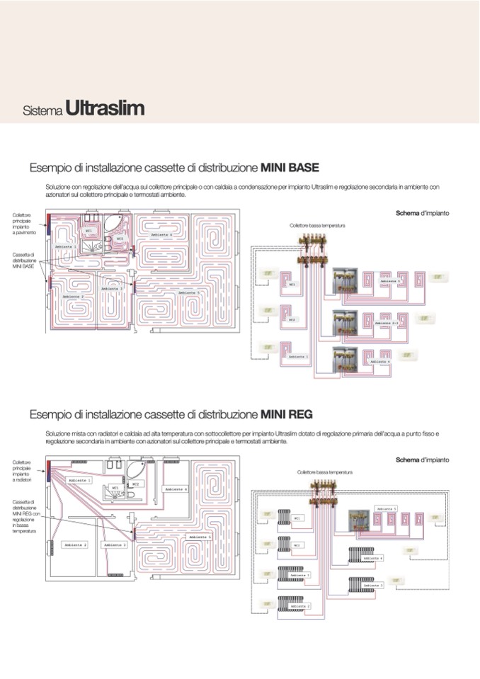 Soluzione con regolazione dell’acqua sul collettore principale o con caldaia a condensazione per impianto Ultraslim e regolazione secondaria in ambiente con