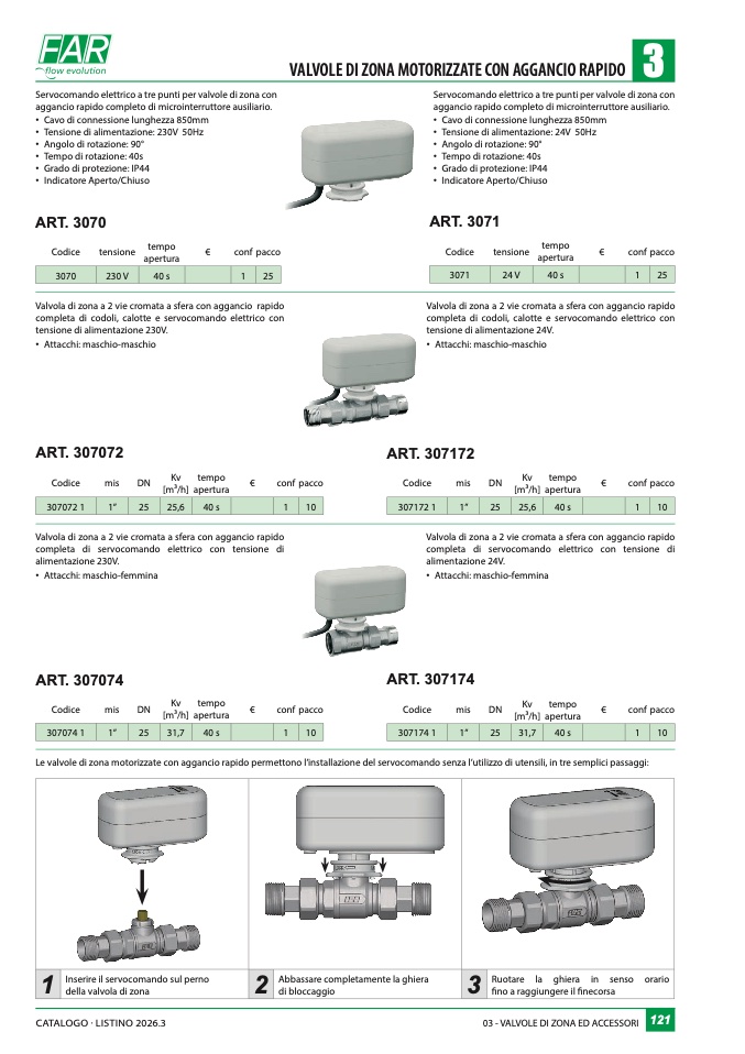 Le valvole di zona motorizzate con aggancio rapido permettono l’installazione del servocomando senza l’utilizzo di utensili, in tre semplici passaggi