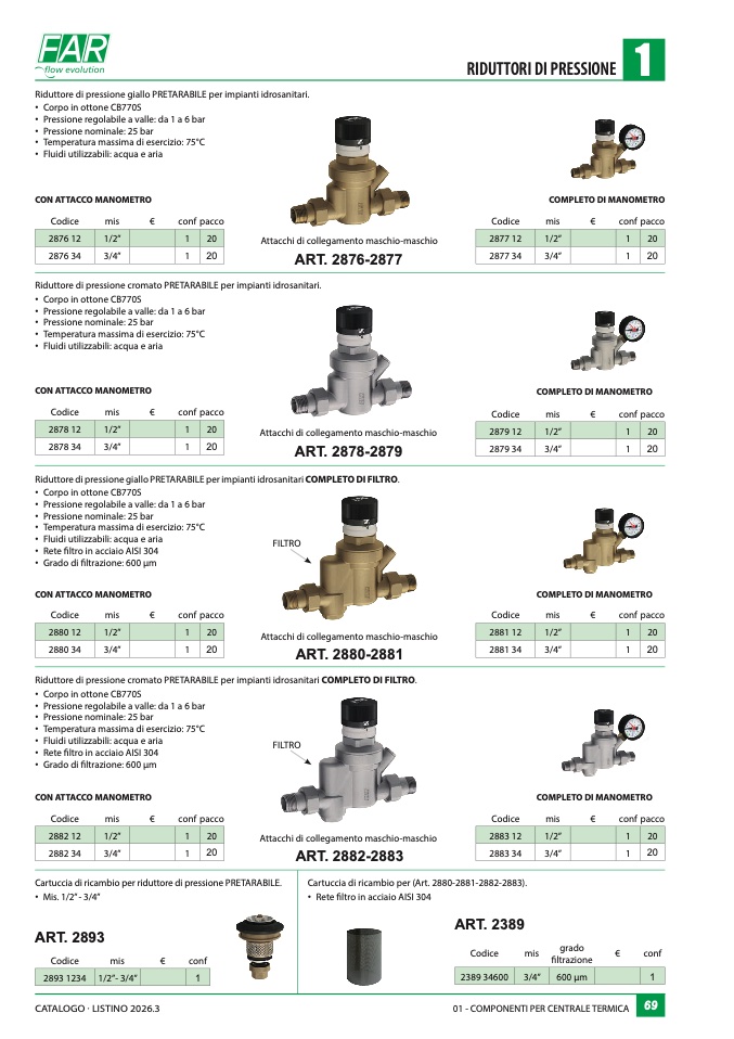 Cartuccia di ricambio per riduttore di pressione PRETARABILE
