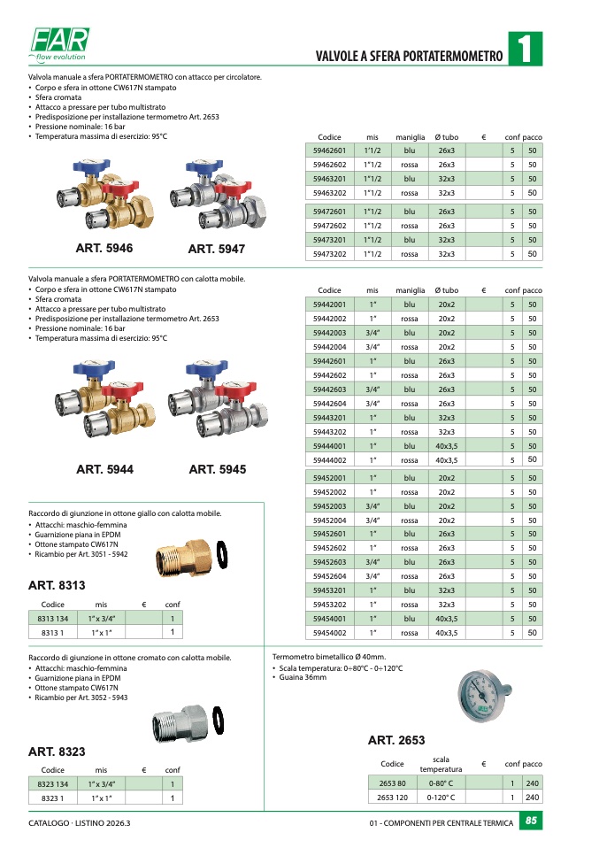 Valvola manuale a sfera PORTATERMOMETRO con calotta mobile.