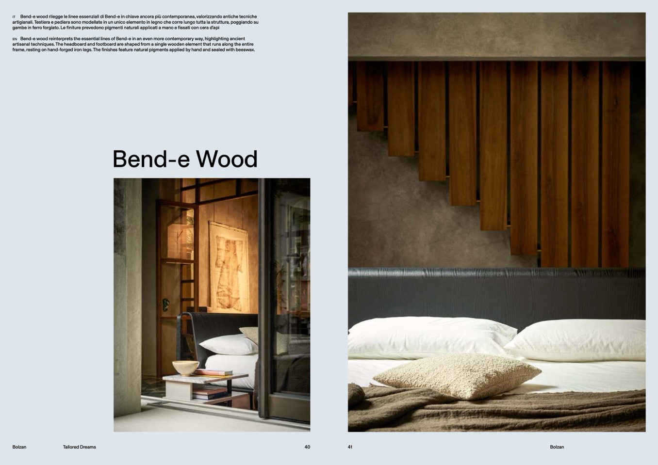 artisanal techniques. The headboard and footboard are shaped from a single wooden element that runs along the entire
