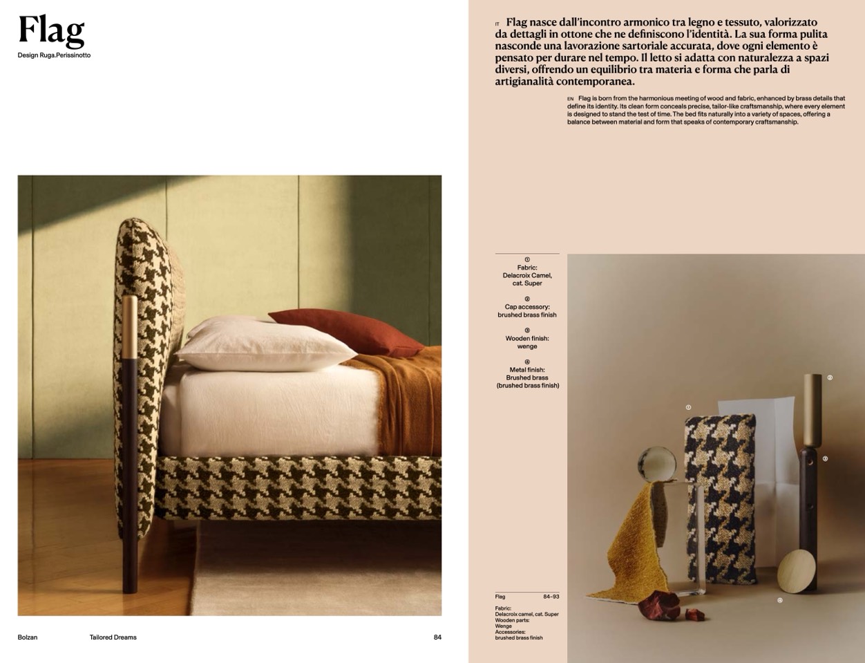 Flag is born from the harmonious meeting of wood and fabric, enhanced by brass details that