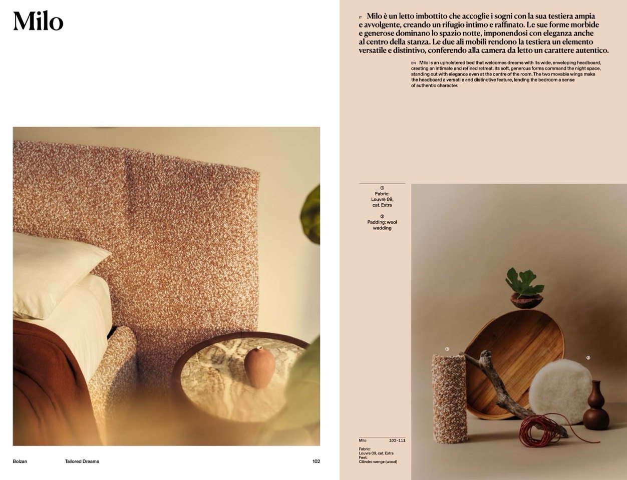 Milo is an upholstered bed that welcomes dreams with its wide, enveloping headboard,