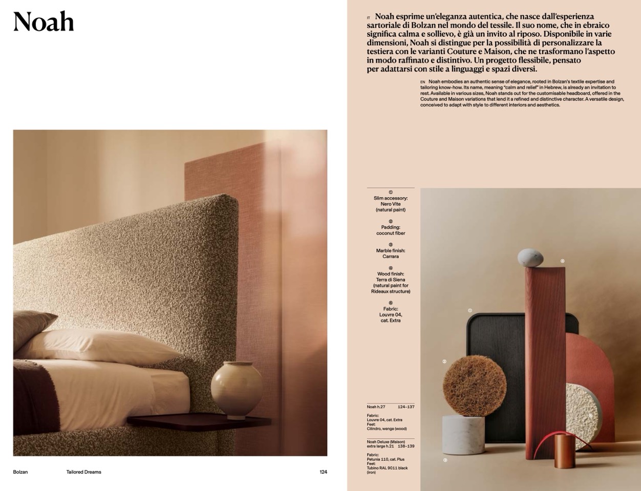 rest. Available in various sizes, Noah stands out for the customisable headboard, offered in the