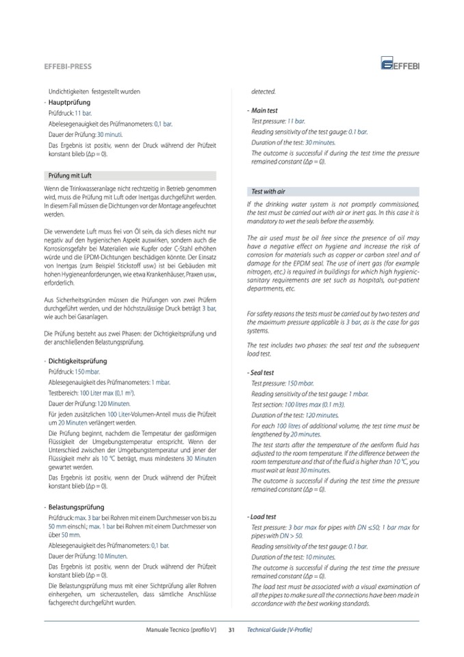 Prüfdruck: max. 3 bar bei Rohren mit einem Durchmesser von bis zu