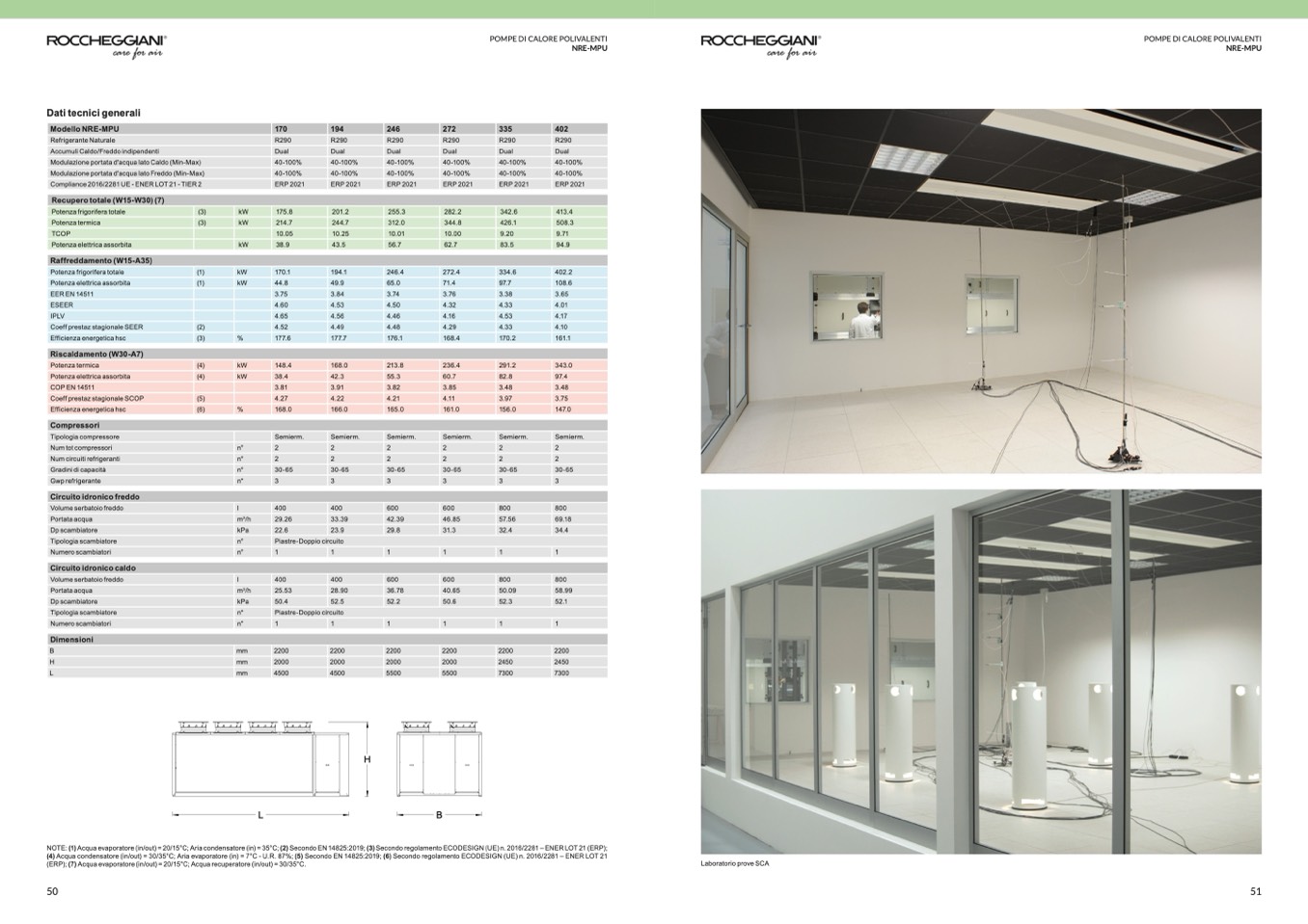 NOTE: (1) Acqua evaporatore (in/out) = 20/15°C; Aria condensatore (in) = 35°C; (2)Secondo EN 14825:2019; (3) Secondo regolamento ECODESIGN (UE) n. 2016/2281 – ENER LOT 21 (ERP);