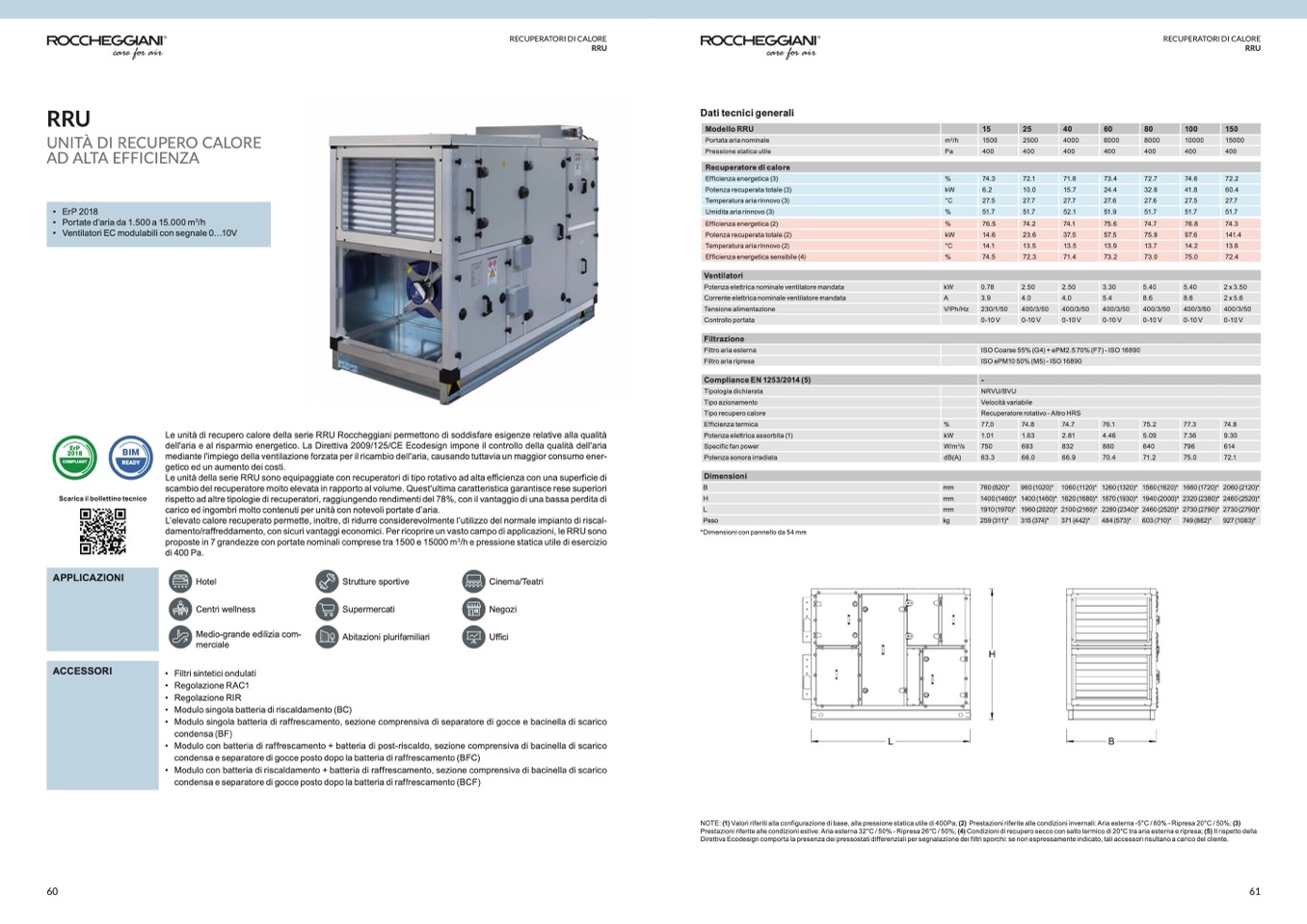 Prestazioni riferite alle condizioni estive: Aria esterna 32°C / 50% - Ripresa 26°C / 50%; (4) Condizioni di recupero secco con salto termico di 20°C tra aria esterna e ripresa; (5) Il rispetto della