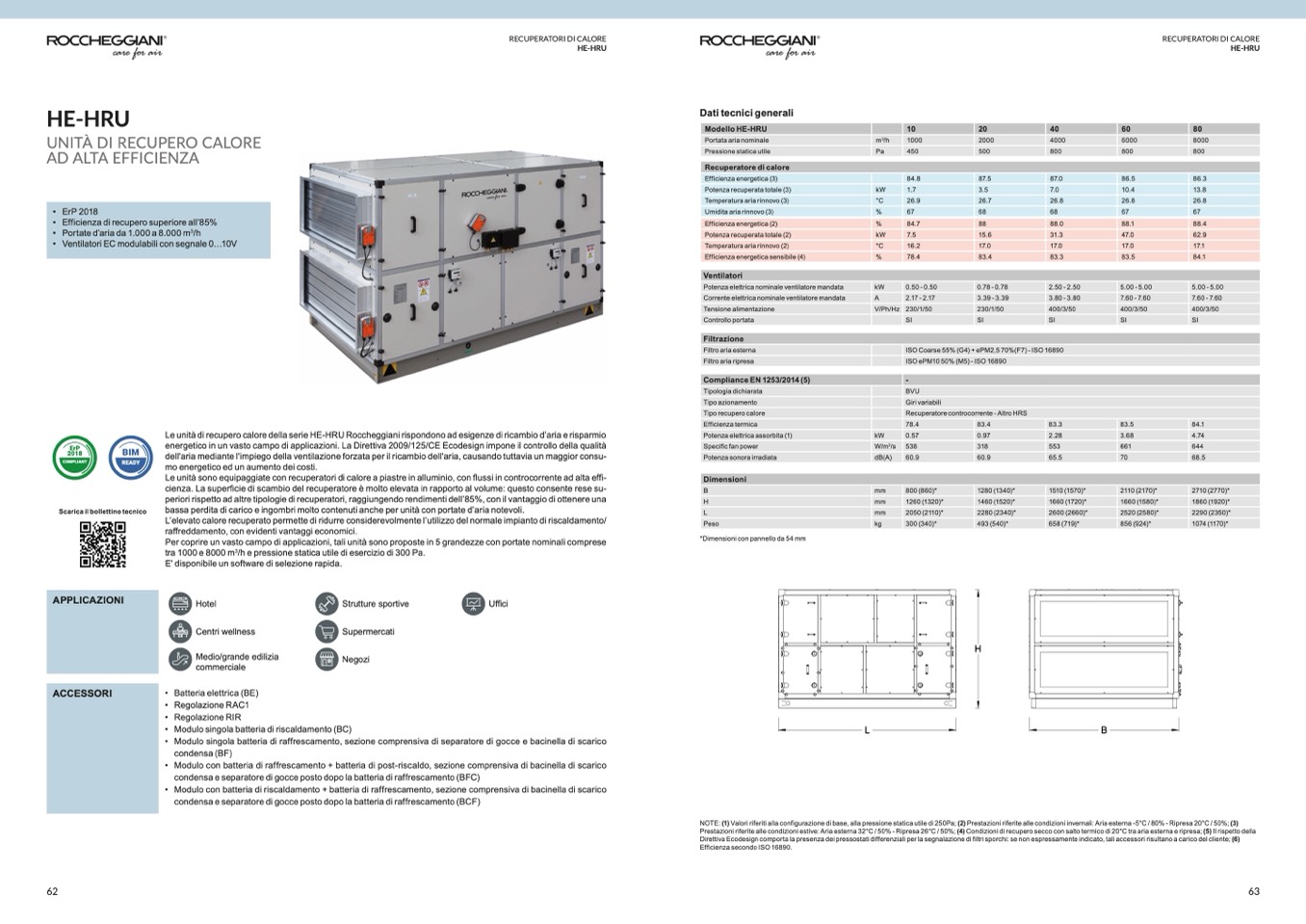 Prestazioni riferite alle condizioni estive: Aria esterna 32°C / 50% - Ripresa 26°C / 50%; (4) Condizioni di recupero secco con salto termico di 20°C tra aria esterna e ripresa; (5) Il rispetto della
