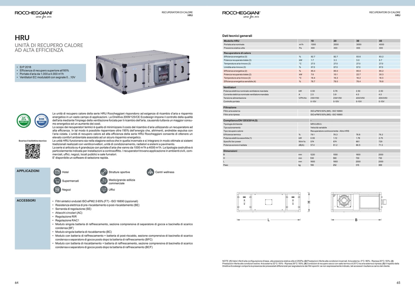 Prestazioni riferite alle condizioni estive: Aria esterna 32°C / 50% - Ripresa 26°C / 50%; (4) Condizioni di recupero secco con salto termico di 20°C tra aria esterna e ripresa; (5) Il rispetto della