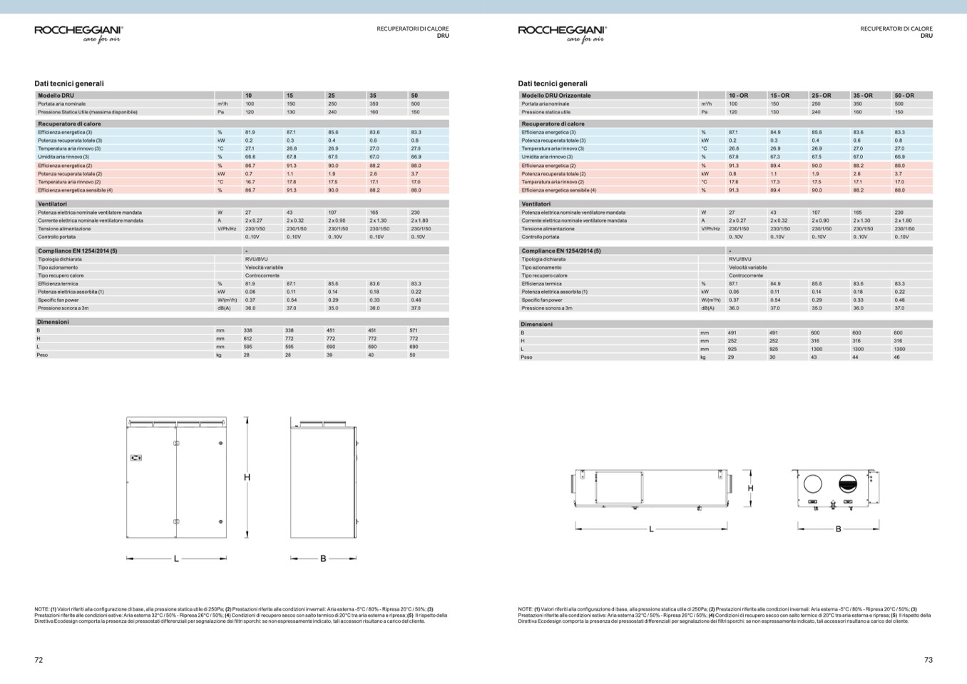 Prestazioni riferite alle condizioni estive: Aria esterna 32°C / 50% - Ripresa 26°C / 50%; (4) Condizioni di recupero secco con salto termico di 20°C tra aria esterna e ripresa; (5) Il rispetto della