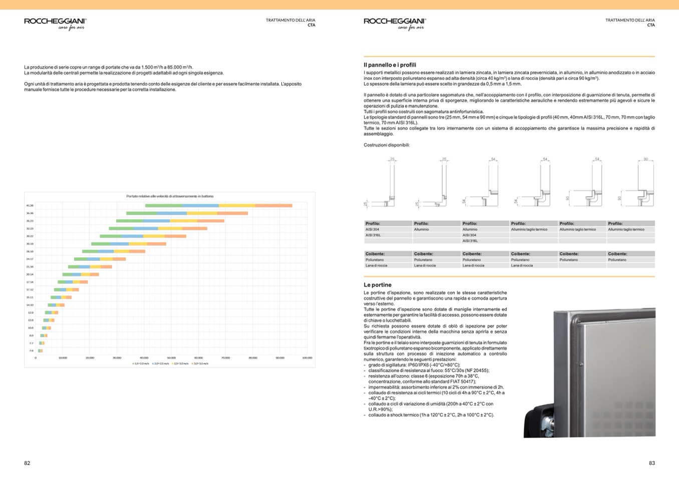 Le tipologie standard di pannelli sono tre (25 mm, 54 mm e 90 mm) e cinque le tipologie di profili (40 mm, 40mm AISI 316L, 70 mm, 70 mm con taglio
