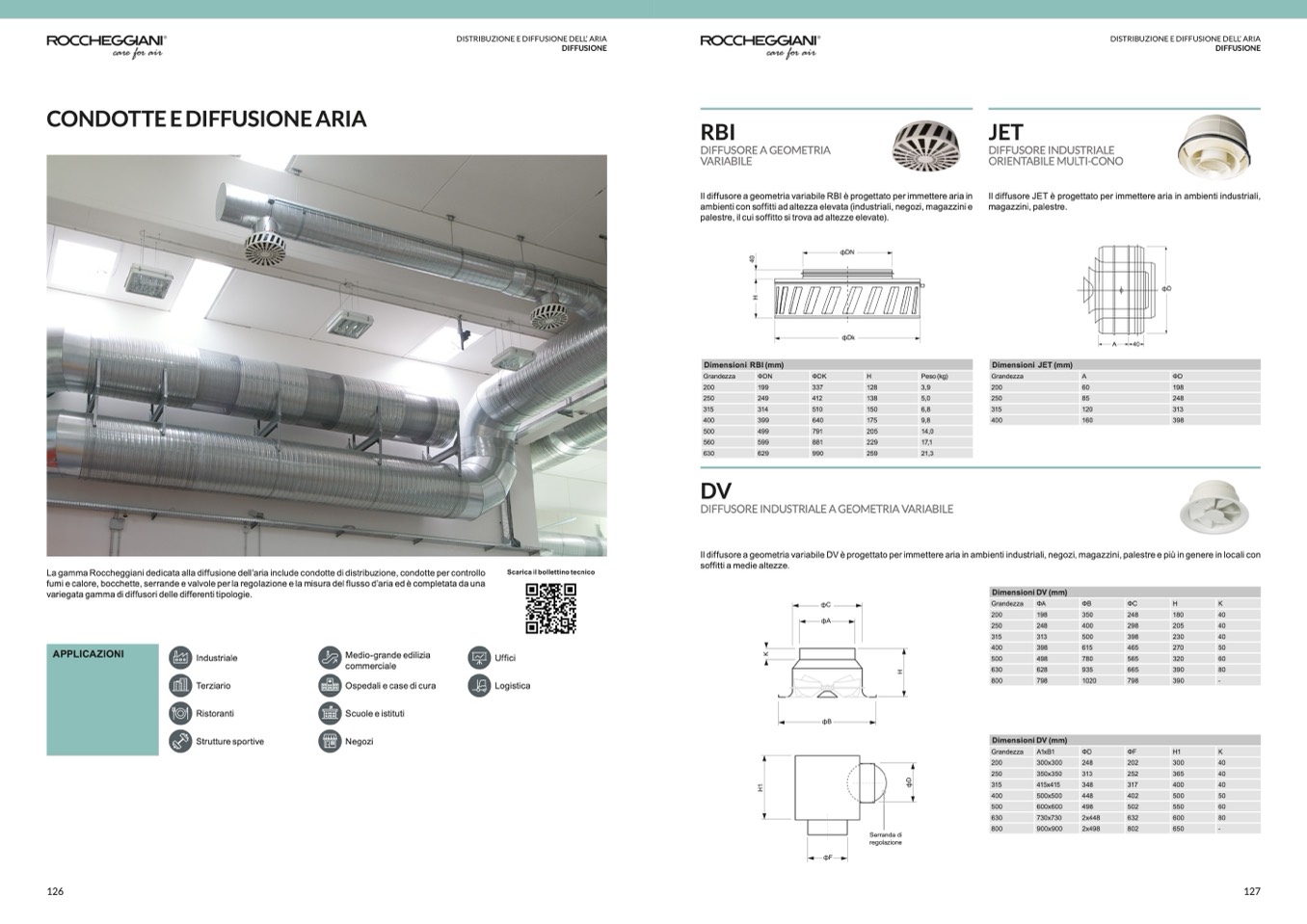 La gamma Roccheggiani dedicata alla diffusione dell’aria include condotte di distribuzione, condotte per controllo