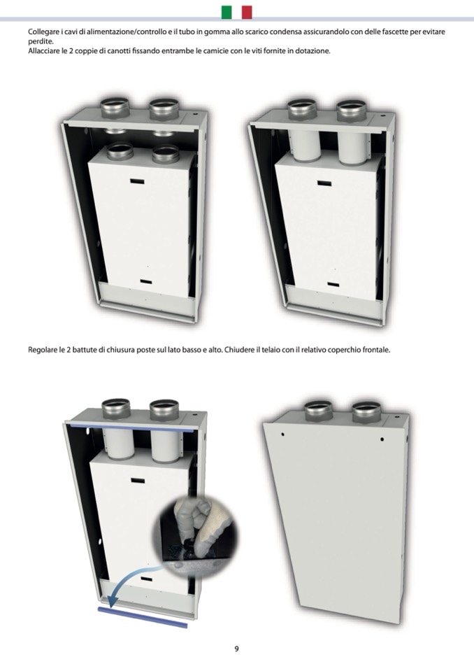 Collegare i cavi di alimentazione/controllo e il tubo in gomma allo scarico condensa assicurandolo con delle fascette per evitar