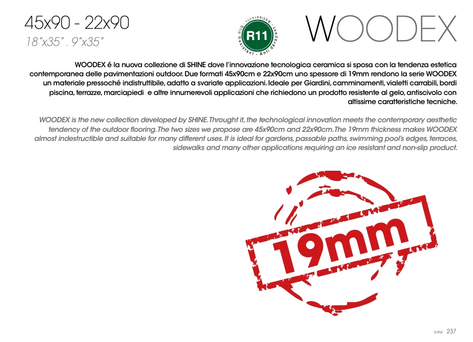 contemporanea delle pavimentazioni outdoor. Due formati 45x90cm e 22x90cm uno spessore di 19mm rendono la serie WOODEX
