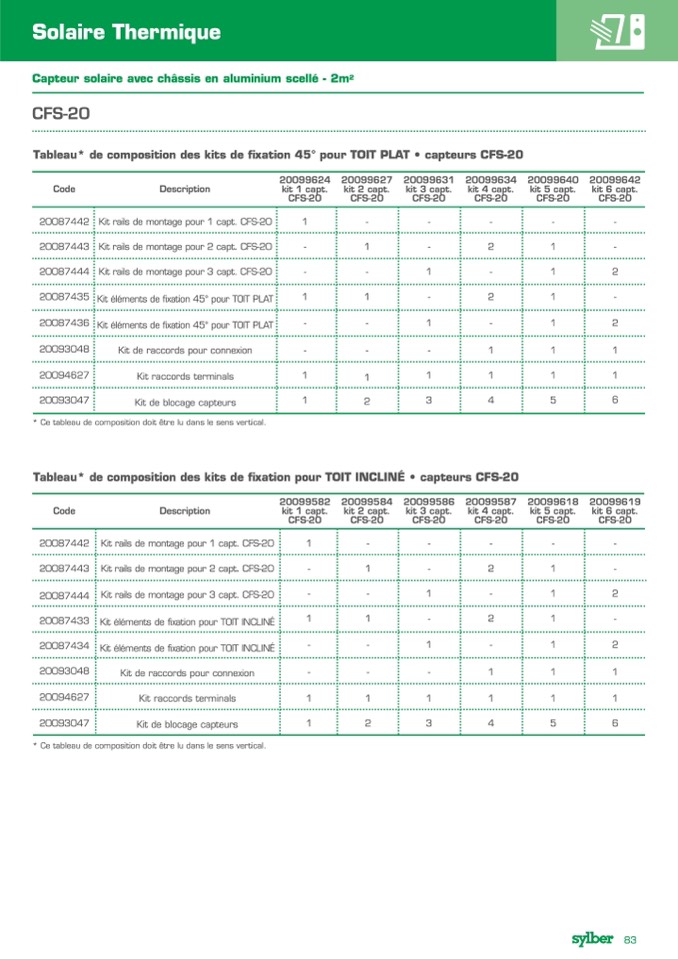 Tableau* de composition des kits de fixation pour TOIT INCLINÉ capteurs CFS-20