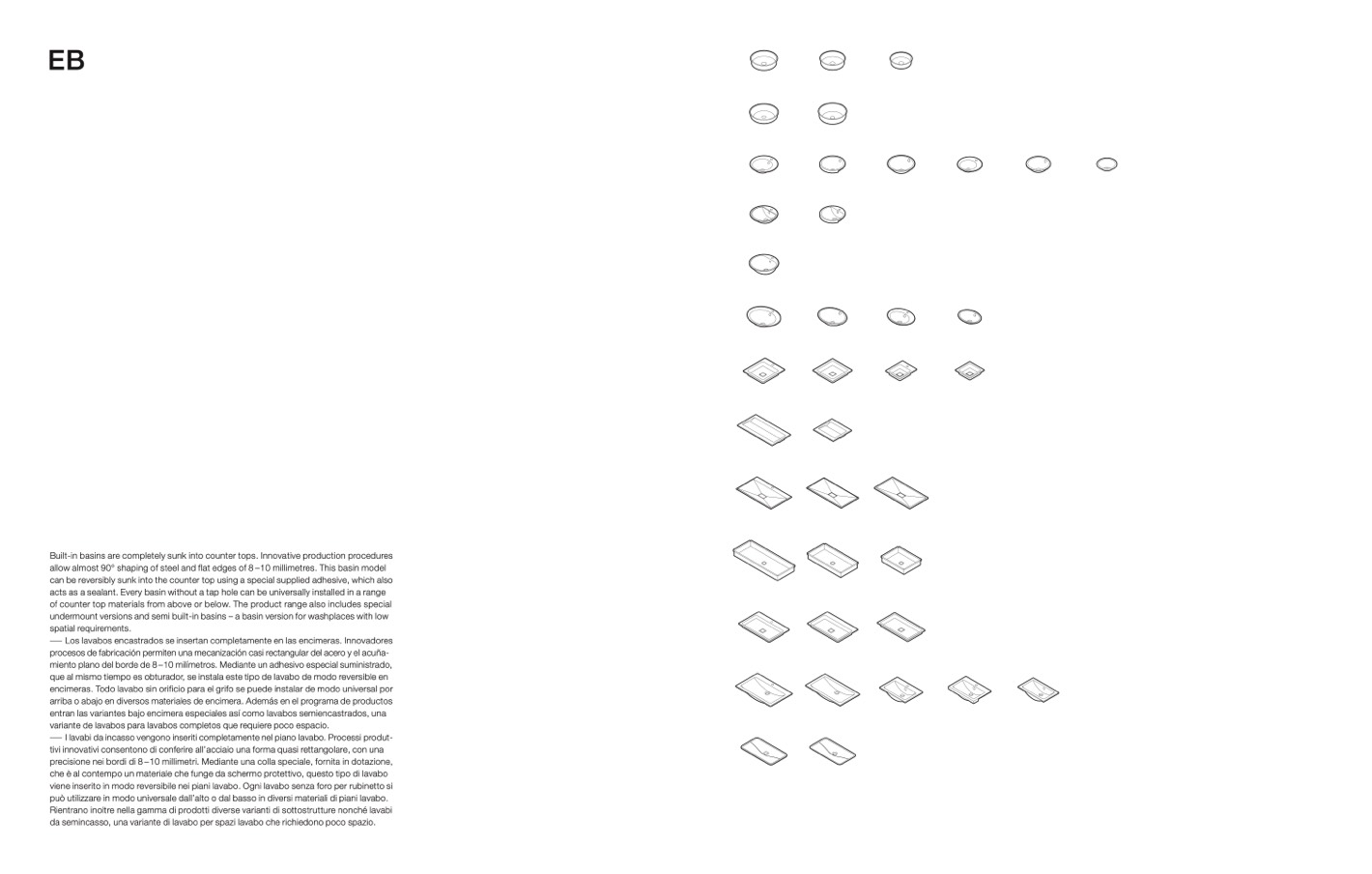 Built-in basins are completely sunk into counter tops. Innovative production procedures