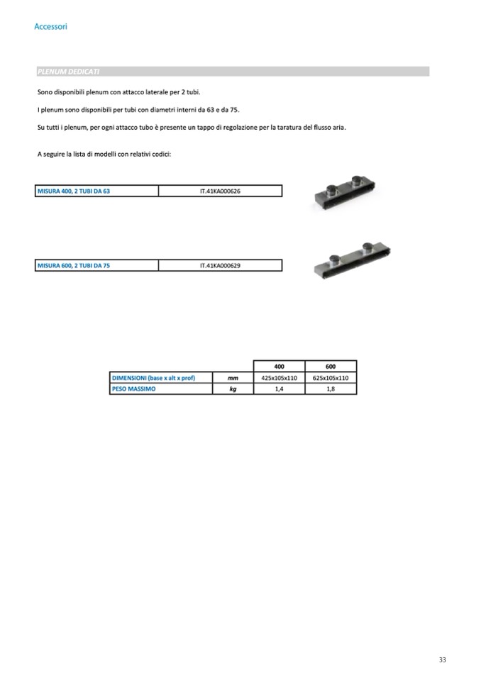 Sono disponibili plenum con attacco laterale per 2 tubi.