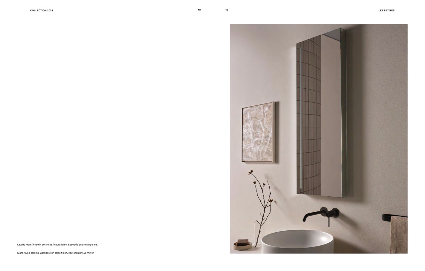 Mare round ceramic washbasin in Talco finish. Rectangular Luc mirror.
