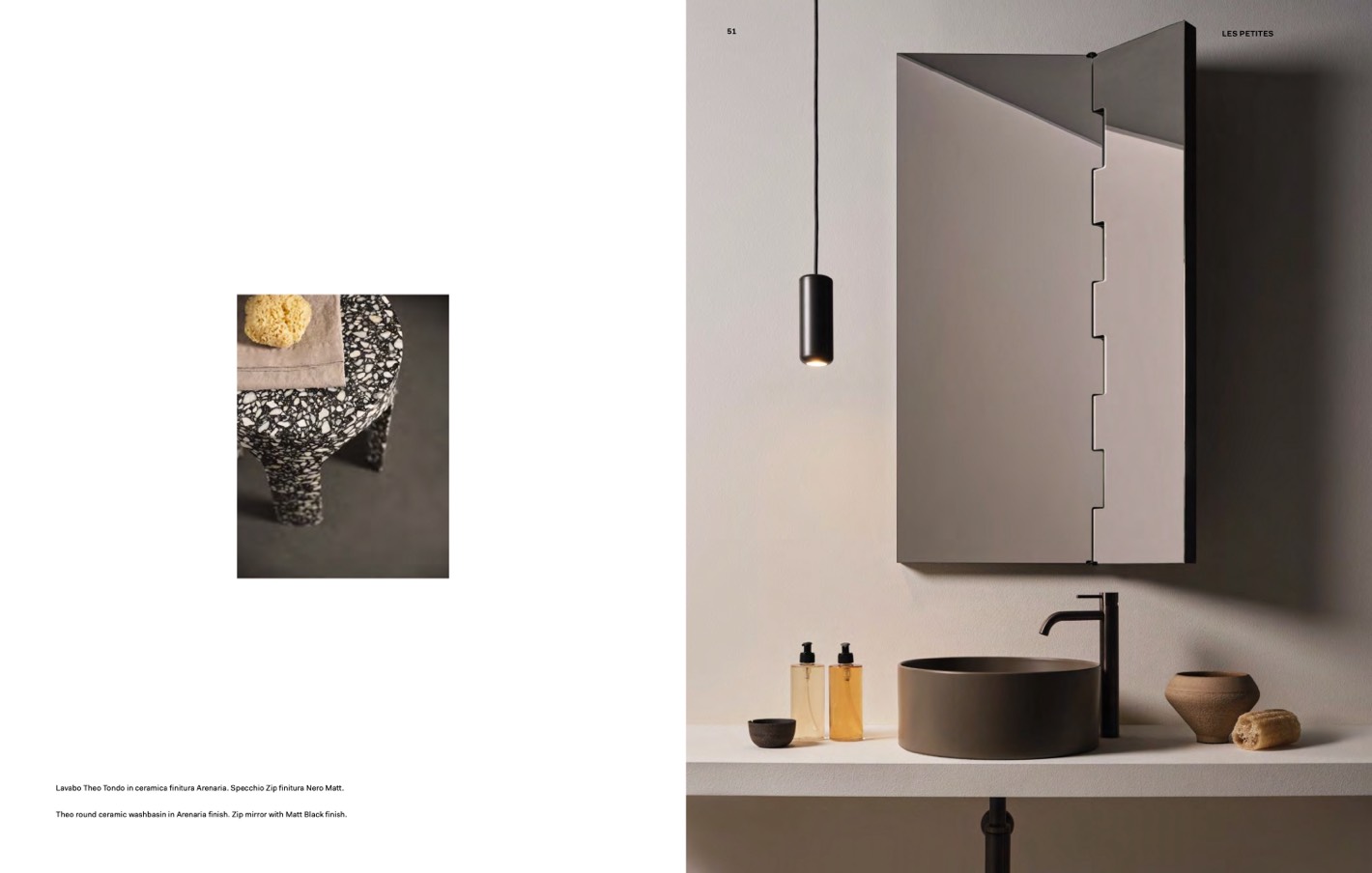 Lavabo Theo Tondo in ceramica finitura Arenaria. Specchio Zip finitura Nero Matt.