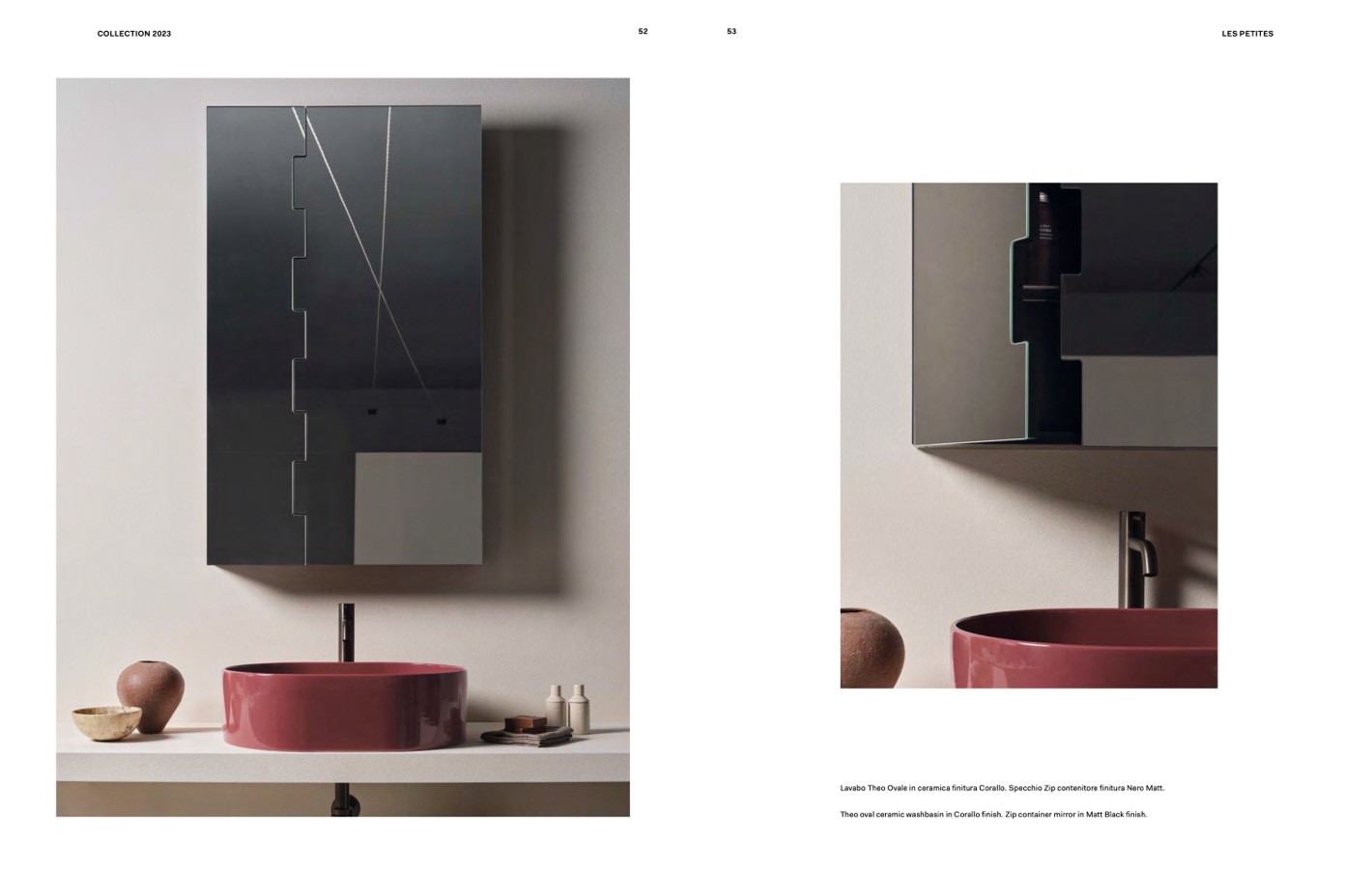 Lavabo Theo Ovale in ceramica finitura Corallo. Specchio Zip contenitore finitura Nero Matt.