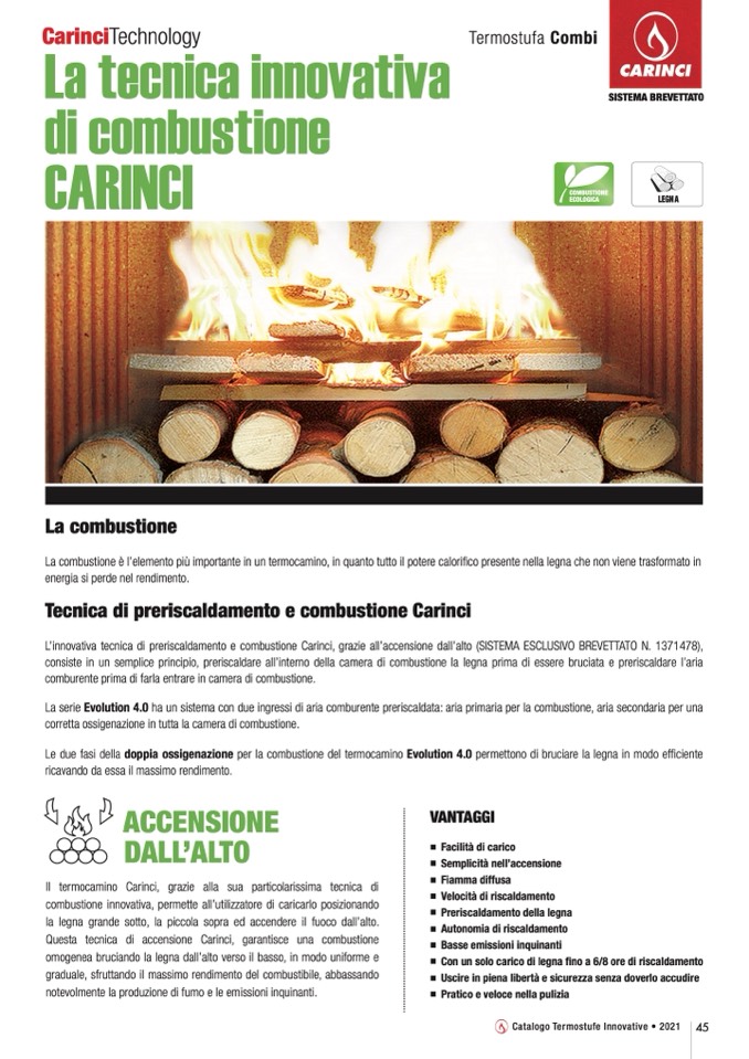 L’innovativa tecnica di preriscaldamento e combustione Carinci, grazie all’accensione dall’alto (SISTEMA ESCLUSIVO BREVETTATO N. 1371478),
