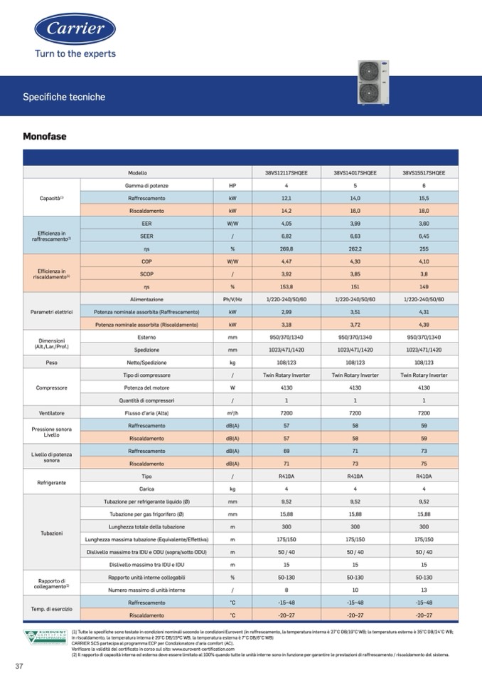 (1) Tutte le specifiche sono testate in condizioni nominali secondo le condizioni Eurovent (in raffrescamento, la temperatura interna è 27°C DB/19°C WB; la temperatura esterna è 35°C DB/24°C WB;