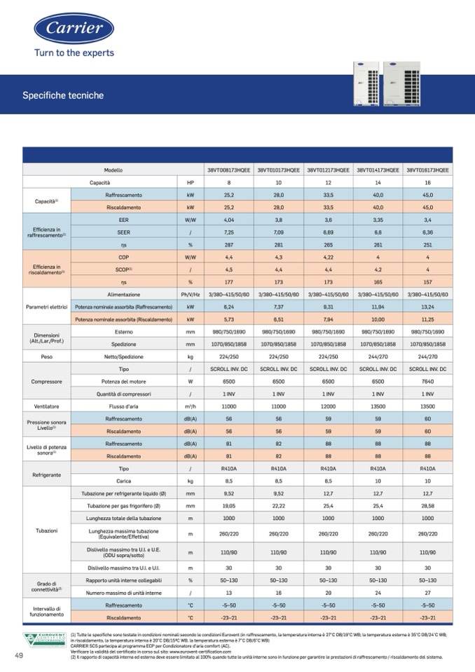 nominali secondo le condizioni Eurovent (in raffrescamento, la temperatura interna è 27°C DB/19°C WB; la temperatura esterna