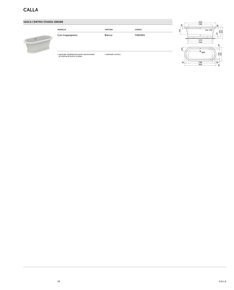 • vasca per installazione centro stanza dotata
