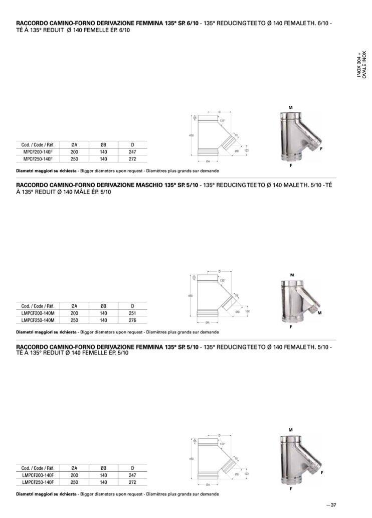 RACCORDO CAMINO-FORNO DERIVAZIONE MASCHIO 135° SP. 5/10 - 135° REDUCINGTEETO Ø 140 MALETH. 5/10 -TÉ