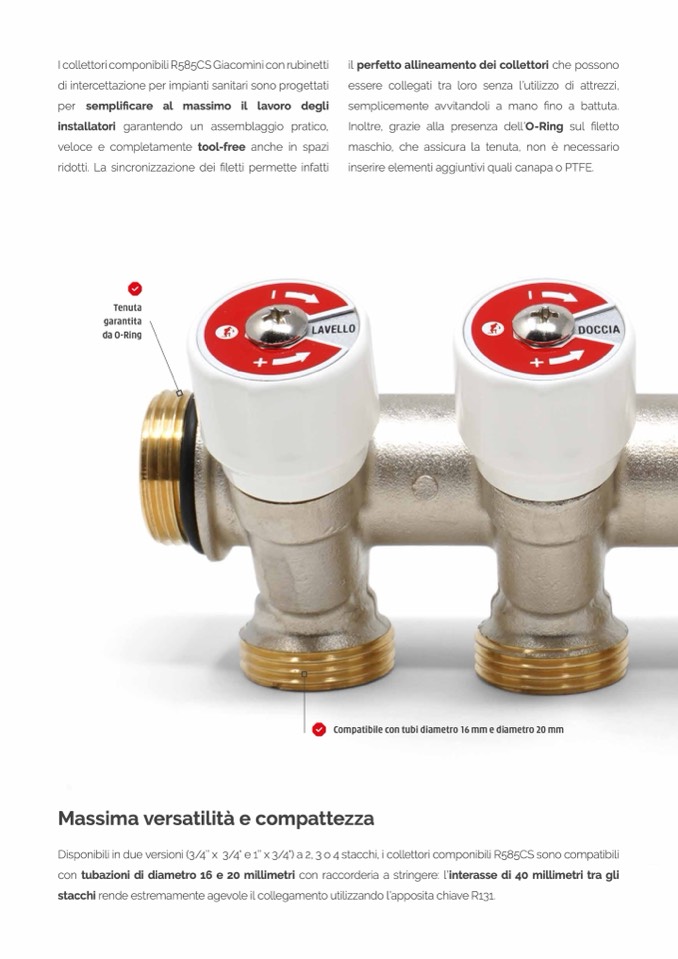 Disponibili in due versioni (3/4’’ x 3/4" e 1’’ x 3/4") a 2, 3 o 4 stacchi, i collettori componibili R585CS sono compatibili